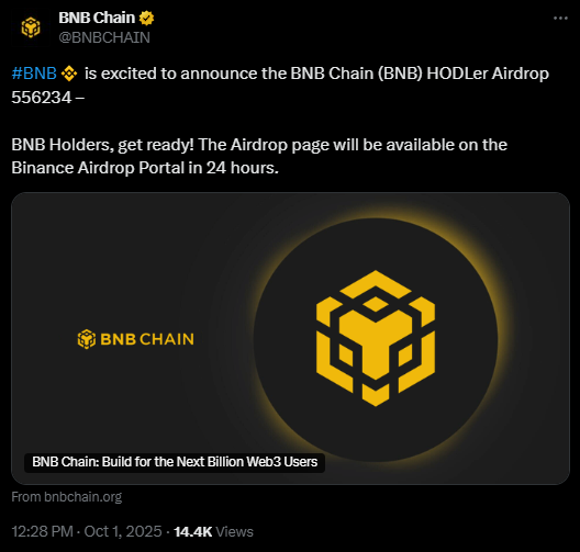 Tangkapan layar unggahan di akun resmi X BNB Chain yang berisi pengumuman airdrop palsu. Sumber: BNB Chain/X