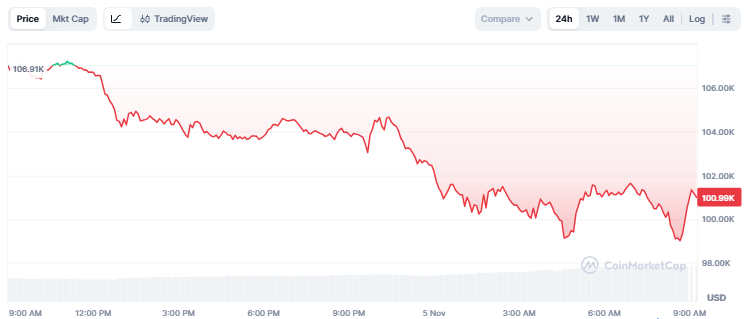 Menurut data CoinMarketCap, Bitcoin turun dari sekitar US$107.200 hingga mencapai US$98.900 sebelum rebound tipis ke kisaran US$100.900 saat artikel ini ditulis. Penurunan tajam ini turut menekan kapitalisasi pasar Bitcoin ke US$2,01 triliun.