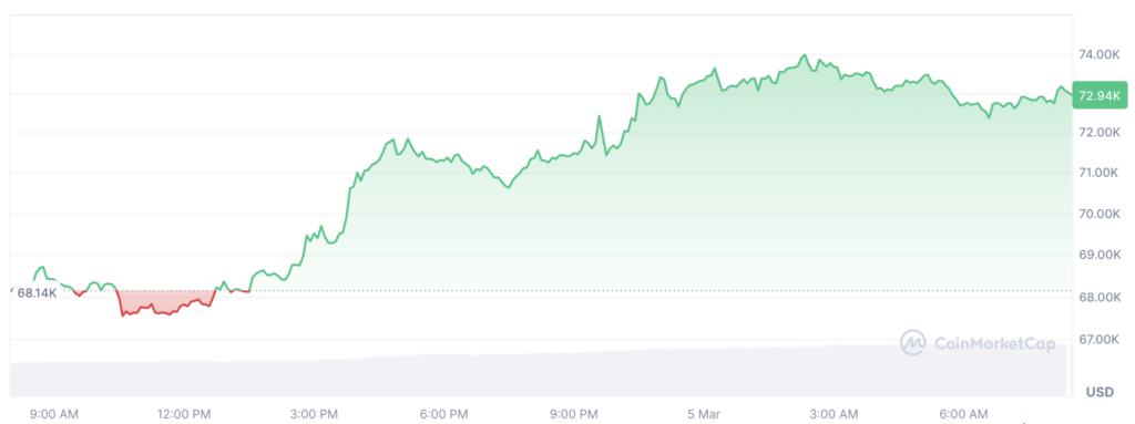 Berdasarkan data CoinMarketCap pada Kamis (5/3/2026) pagi, harga Bitcoin tercatat naik sekitar 6 persen dalam 24 jam terakhir. BTC bergerak dari level sekitar US$68.000 hingga sempat menyentuh titik tertinggi harian di US$74.000, sebelum terkoreksi ke kisaran US$72.900 saat artikel ini ditulis.