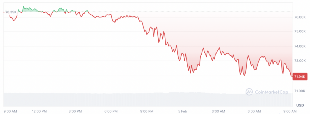 Menurut data CoinMarketCap pada Kamis (5/2/2026), harga Bitcoin terus merosot dari kisaran US$76.000 ke level terendah harian di sekitar US$71.800, mencatat penurunan hingga 5 persen dalam 24 jam terakhir. Kondisi tersebut mendorong kapitalisasi pasar Bitcoin menyusut hingga sekitar US$1,44 triliun.