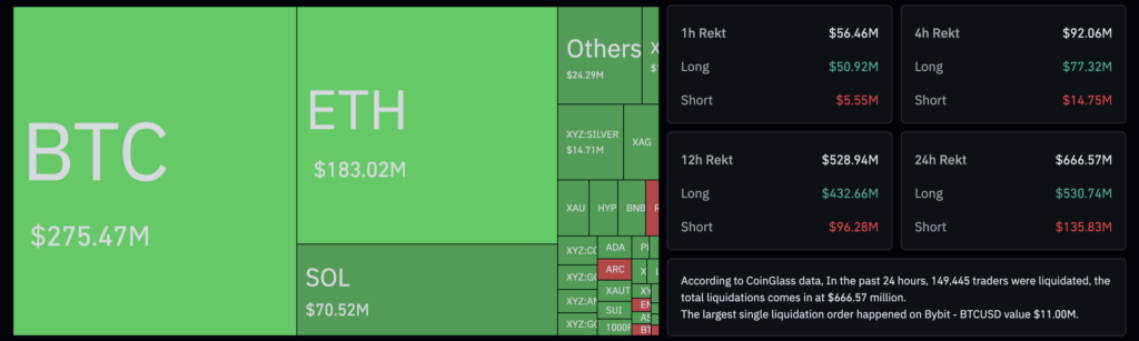 Tekanan di pasar juga tercermin pada sektor derivatif. Data CoinGlass menunjukkan lebih dari US$700 juta posisi kripto, baik long maupun short, terlikuidasi dalam 24 jam terakhir. Bitcoin dan Ethereum masing-masing mencatat likuidasi kripto terbesar dalam sehari.