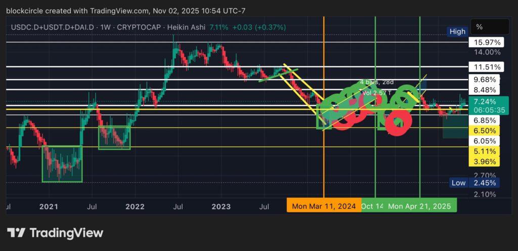 Blockcircle juga menyoroti dominasi stablecoin global yang kini berada di zona resistensi penting, yakni di kisaran 6–7 persen pada awal November. Area ini dinilai sebagai titik keputusan utama bagi arah modal di pasar kripto.