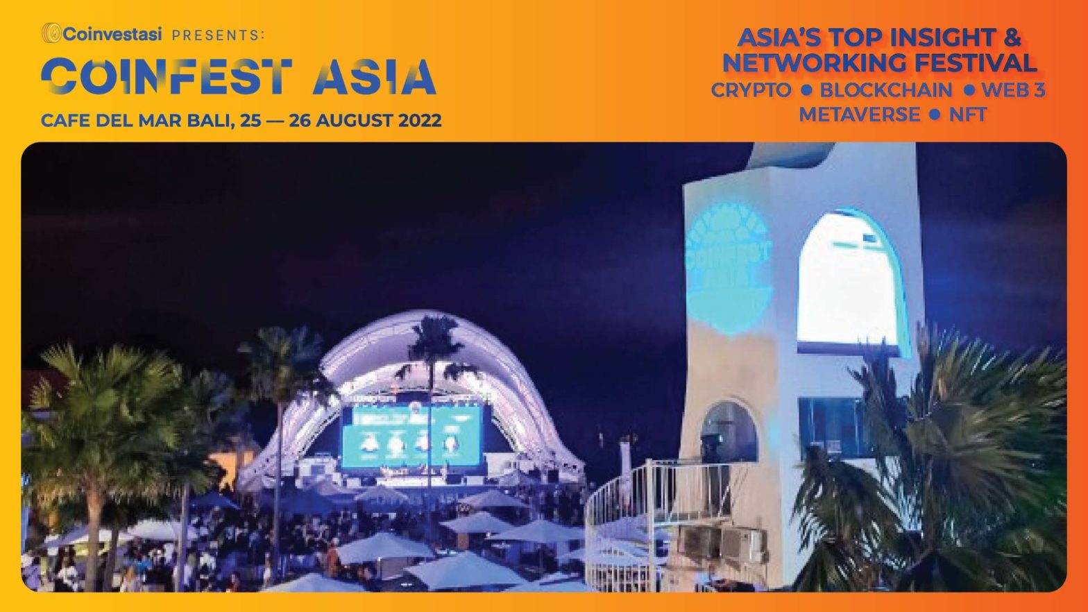 Acara festival kripto terbesar di Asia, Coinfest Asia telah sukses dilaksanakan pada 25-26 Agustus 2022 di Cafe Del Mar Bali. Acara yang kehadiran lebih dari 1.000 orang ini berhasil menyedot atensi berbagai pihak dari penggemar kripto, publik figur, investor, developer, hingga regulator.