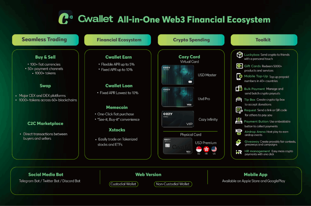 Peluncuran versi 3.0 membawa serangkaian fitur baru yang dirancang untuk memenuhi kebutuhan pengguna di seluruh dunia. Beberapa di antaranya meliputi peningkatan kemampuan trading, alat keuangan seperti Cwallet Earn dan Cwallet Loan, serta inovasi baru seperti Memecoin Market, xStocks Trading, dan Cozy Card.