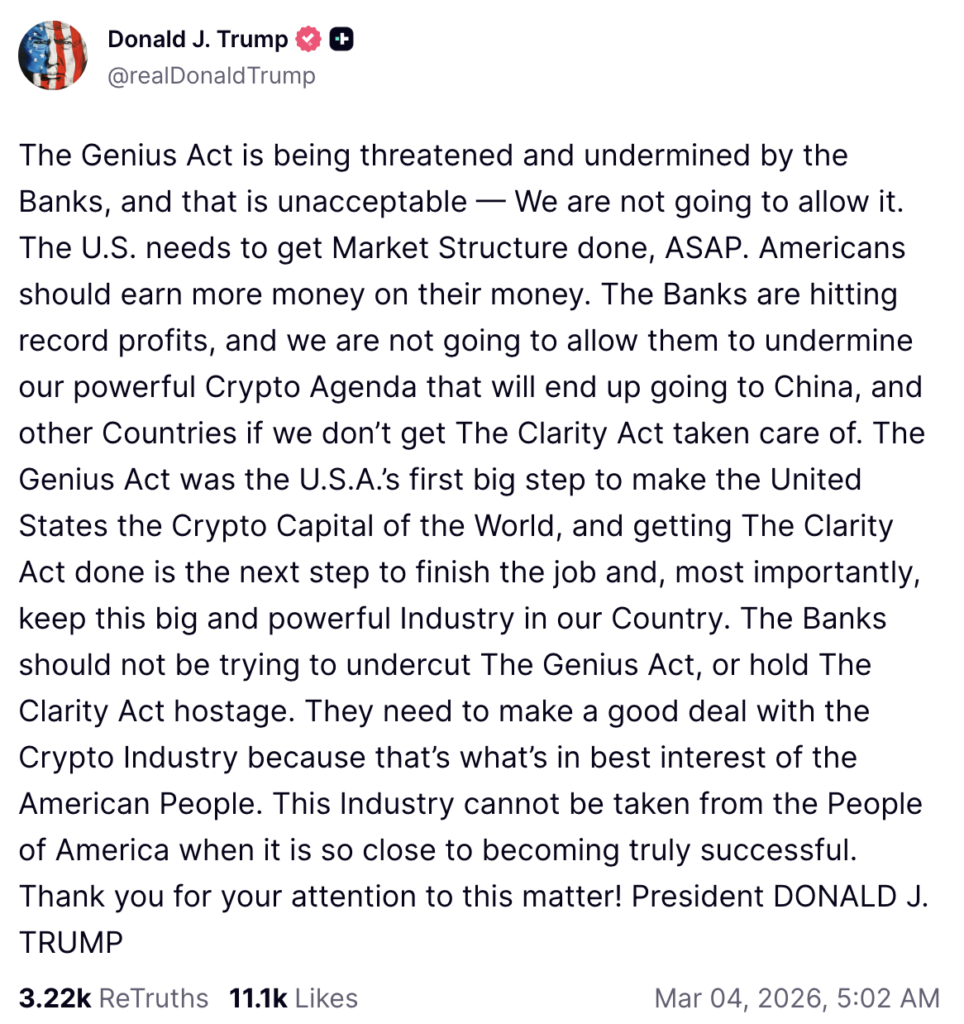 “GENIUS Act sedang terancam dan dilemahkan oleh bank-bank, dan itu tidak dapat diterima, kami tidak akan membiarkannya terjadi,” tulis Trump dalam unggahannya.