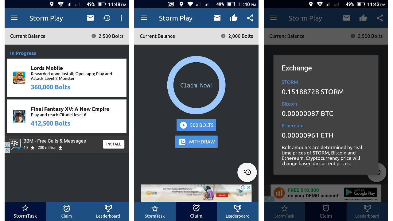 Semua iklan yang akan dilihat akan dibayar sebesar 500 Bolt, yang nantinya akan dikonversi menjadi satuan Storm. Di akun ini Anda bisa langsung melihat total koin yang dikumpulkan dalam bentuk Storm yang langsung dikenversi kedalam Bitcoin dan Ethereum. Mata uang digital Storm saat ini bisa ditukark di bursa kripto Hitbtc, sementrara untuk bitcoin bisa menukarnya di VIP Bitcoin.