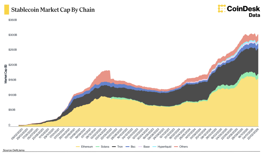 BNB Chain (BSC) mencatat pertumbuhan stablecoin tercepat di antara jaringan utama dalam setahun terakhir. Berdasarkan riset CoinDesk bertajuk Digital Assets 2026: Above the Noise, kapitalisasi stablecoin di jaringan ini melonjak 133 persen secara tahunan, melampaui Ethereum, Solana, TRON, hingga jaringan baru seperti Hyperliquid dan Base.