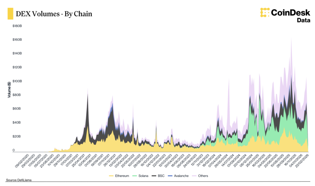 Kinerja tersebut tidak hanya terlihat dari sisi kapitalisasi. Sepanjang 2025, volume perdagangan tahunan DEX di BNB Chain meningkat lebih dari 100 persen. Pada puncaknya di Juli 2025, jaringan ini bahkan sempat melampaui Solana dan Ethereum dalam volume harian, dengan pangsa pasar mendekati 30 persen dari total volume DEX global.