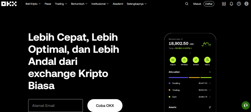 OKX adalah salah satu exchange aset kripto global terbesar di dunia, dengan puluhan juta pengguna yang tersebar di lebih dari 160 negara. Platform ini memungkinkan pengguna untuk membeli, menjual, melakukan staking, serta memperdagangkan berbagai produk turunan seperti futures dan options.