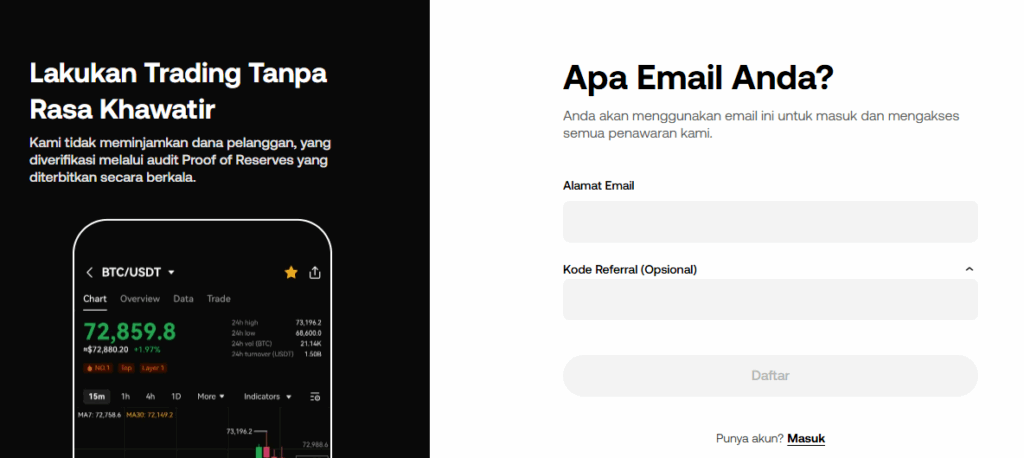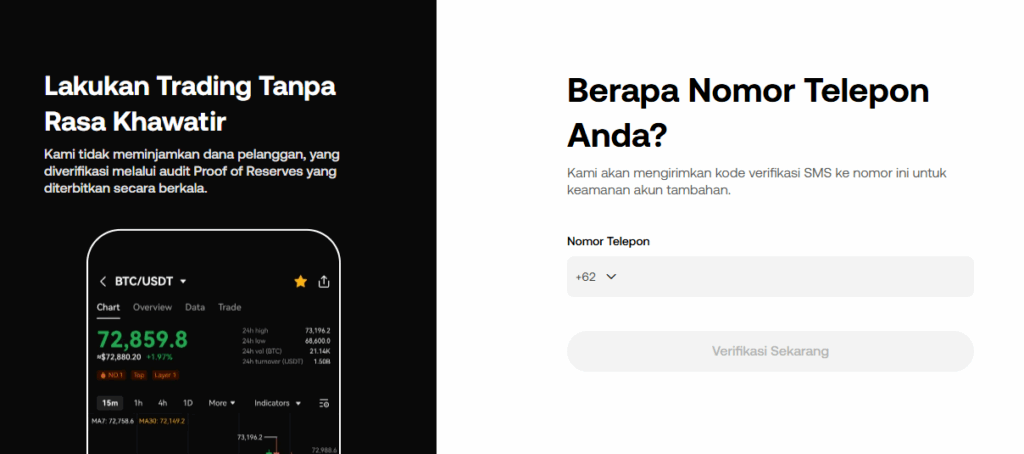 Sebelum dapat menggunakan layanan perdagangan atau wallet-nya, pengguna perlu membuat akun terlebih dahulu. Proses pendaftaran berlangsung cepat dan aman dengan sistem verifikasi berlapis.