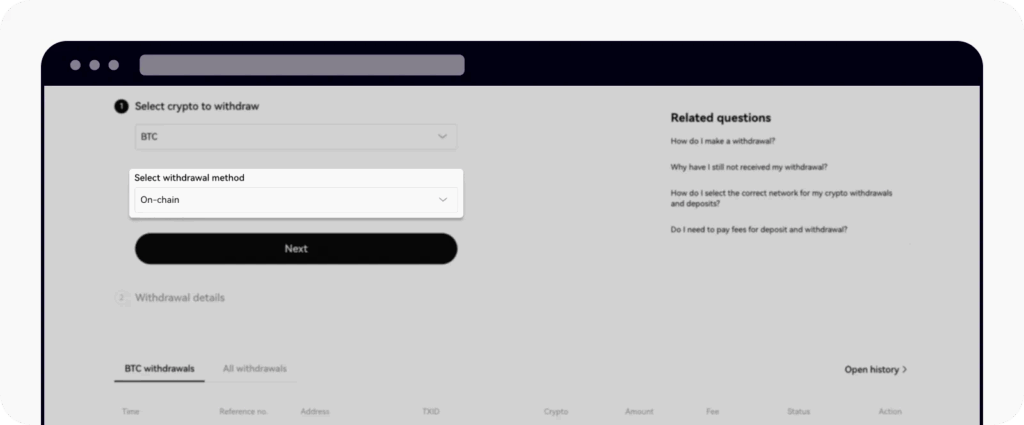 • Pilih aset kripto dan metode penarikan (on-chain atau internal).