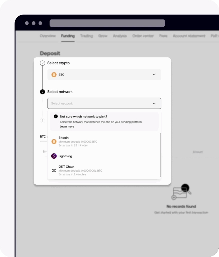 Pilih tujuan deposit kripto. Sumber: OKX