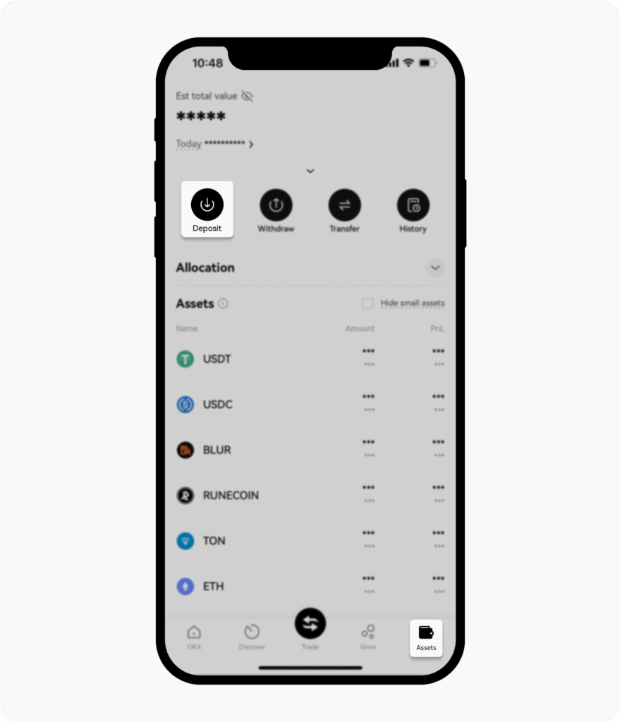 • Buka aplikasi OKX, lalu pilih Deposit melalui halaman utama atau menu Assets.