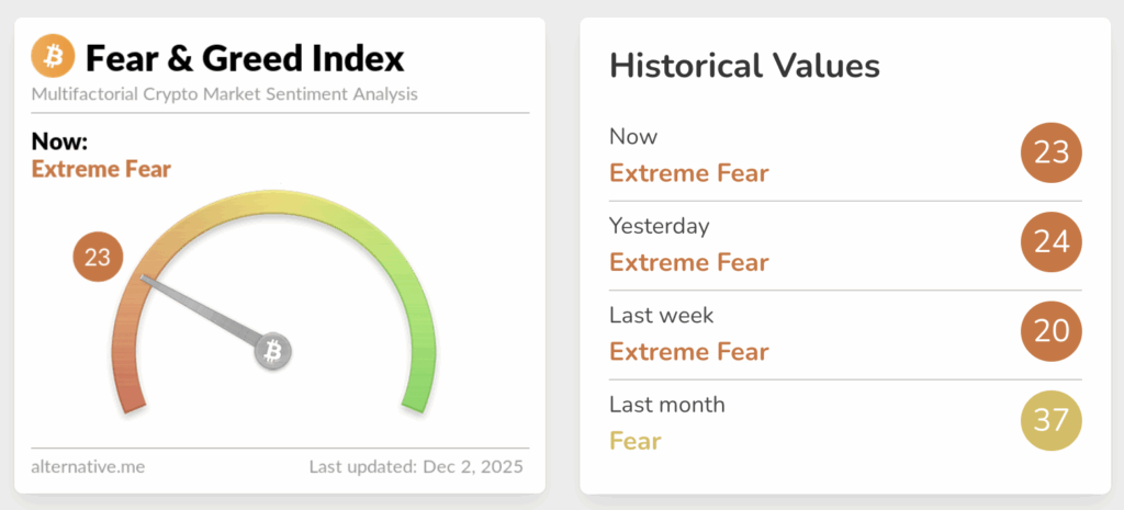 Dalam sebulan terakhir, indeks Fear and Greed kripto terus berada pada zona ketakutan. Hingga artikel ini ditulis, indeks tersebut berada di level 23 dari 100, mencerminkan kondisi ketakutan ekstrem yang membuat banyak investor menahan diri untuk masuk kembali ke pasar.