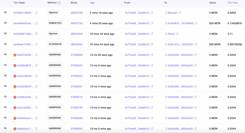 Data Socialscan menunjukkan bahwa wallet kripto dengan address 0x7f4e menerima sekitar US$112.700 atau setara Rp1,8 miliar dalam bentuk token MON sebagai bagian dari aktivitas menjelang peluncuran resmi jaringan Monad. Namun, seluruh alokasi tersebut hilang karena ratusan transaksi yang gagal dieksekusi tetapi tetap memotong gas fee.
