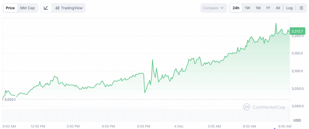 Menyusul upgrade ini, harga Ethereum terpantau mengalami kenaikan signifikan mencapai 6% dalam 24 jam terakhir, mencapai harga tertinggi harian di US$3.232 dengan kapitalisasi pasar mencapai US$387 miliar.